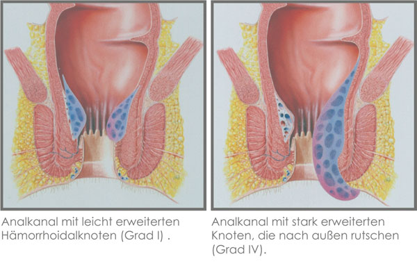 Bei zu starkem Pressen, durch Schwangerschaft oder altersbedingt können mit Blut gefüllte, knotenförmige Erweiterungen entstehen, die in fortgeschrittenem Stadium nach außen rutschen (Prolaps) und sich nicht mehr von selbst in den Analkanal zurückziehen.